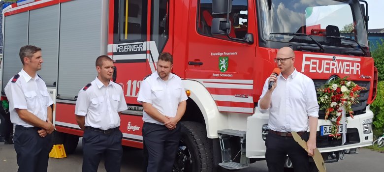 Im Anschluss folgte der offizielle Teil des Festes mit der Einsegnung des TLF 3000 durch den Pfarrer Krosch und die symbolische Schlüsselübergabe durch Bürgermeister Pfennings.