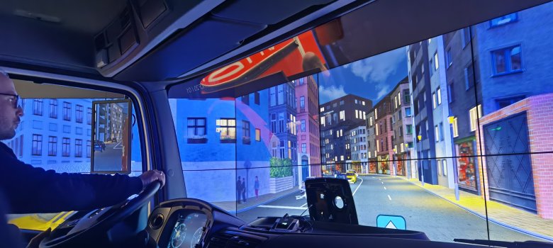 Am 16. März konnten insgesamt zwölf Teilnehmende in das Führerhaus eines „echten“ Einsatzfahrzeugs in Lkw-Größe steigen und verschiedene virtuelle Fahrsituationen nachstellen. Dabei wurden wechselweise drei theoretische und drei praktische Module absolviert einschließlich einer Videoauswertung zur „Manöverkritik“. Nebel, Regen aber auch der Unterschied zwischen Stadt- oder Landfahrten sorgten für jede Menge Herausforderungen.