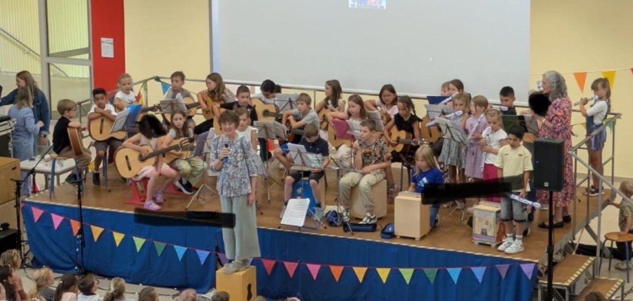 Seit August 2024 wurde das Projekt in seiner zweiten Phase mit dem Schwerpunkt auf dem praktischen Instrumentalunterricht fortgeführt. Fünf Lehrkräfte unserer Musikschule unterrichteten die neuen Zweitklässler in Kleingruppen an den Instrumenten Flöte, Gitarre und Cajón. Dabei wurden die Schülerinnen und Schüler von Frau Vorhagen, Herrn Bongart und Herrn Wohlfahrt fachkundig ausgebildet. Ergänzt wurde das Angebot durch zwei große Ensembles unter der Leitung von Frau Erdmann-Holder mit der Unterstützung von Frau Nesselrode.